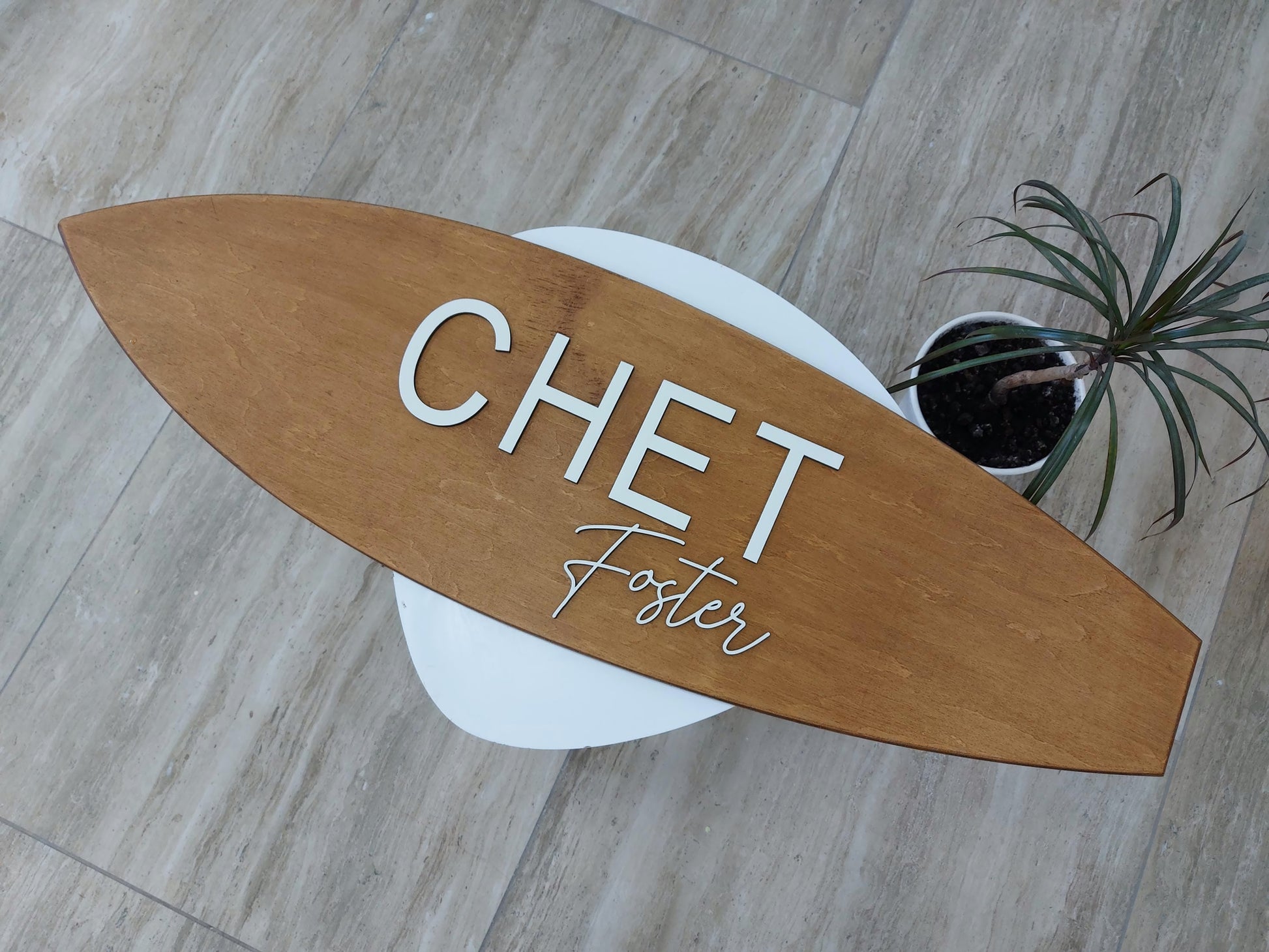 No two surfboard signs are alike, as the natural wood grain, knots, and hand painting on each board are unique, ensuring that your piece is truly one-of-a-kind.